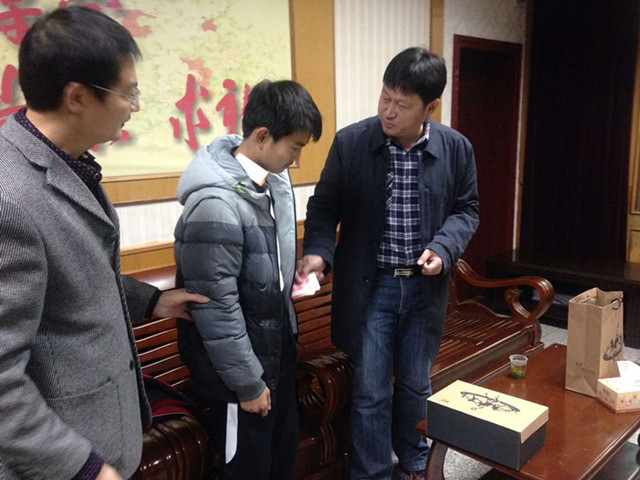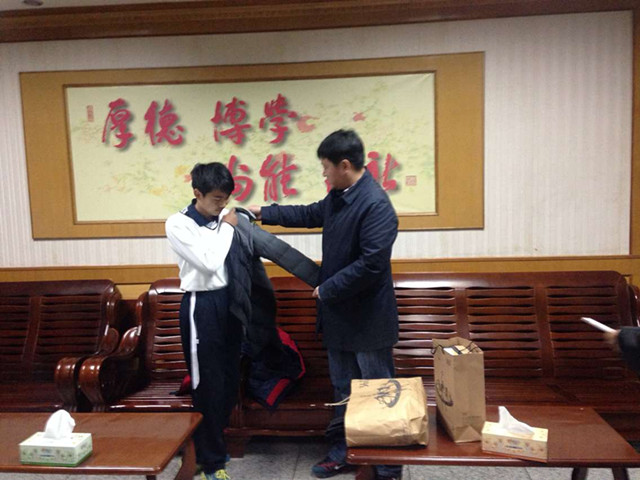 近日,看到大幅降温降雪的天气预报,付洪马上抽出时间为李强精心挑选了羽绒服、羽绒裤、保暖鞋,并带着600元钱一大早冒着雨雪天气赶到学校看望李强,询问李强是否适应高中学习环境,为他鼓劲加油。
