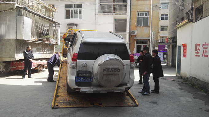 3月28日上午12时许,郧西法院执行干警联系的一辆拖车将被执行人谈某的丰田霸道车拖入法院,将该辆涉嫌转移的车辆依法强制查封扣押。被执行人谈某迫于强制执行的威力,当日主动兑付了执行款,一起民间借贷纠纷案件高效结案。