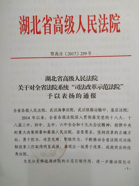 2017年12月28日,湖北省高级人民法院召开全省法院系统司法体制改革工作表彰大会,郧西县人民法院被省高院授予全省法院系统“司法改革示范法院”。